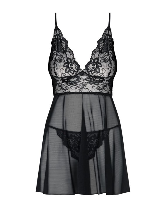 Zarówno babydoll, jak i dołączone stringi utrzymane są w jednolitej, eleganckiej stylistyce - ten sam koronkowy wzór tworzy harmonijną kompozycję. Detale koronkowe umieszczone na linii biustu i tuż pod nim pięknie akcentują kształty, dodając zestawowi nuty luksusu i zmysłowości.