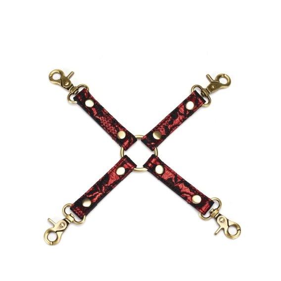Ten solidny hogtie mocno trzyma ręce i nogi twojego kochanka za jego plecami. Wykonany z rubinowo-czerwonej wegańskiej skóry i wykończony bogatą czarną koronką, elegancki hogtie bondage doda odrobinę starego wiktoriańskiego glamour do Twojego pudełka na zabawki. Po prostu przymocuj je do pasujących pasujących pasów na nadgarstki i kostki i obserwuj z zachwytem, jak wiją się, aby się uwolnić.