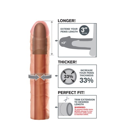 Jedną z głównych zalet tej fantastycznej nakładki jest możliwość natychmiastowego i bezpiecznego wydłużenia penisa o 3 cale (7,62 centymetra) oraz pogrubienie go o około 33%. Fantasy X-tensions Perfect 3" Extension Light jest również niezwykle uniwersalnym gadżetem, który pasuje do większości ciał, co pozwala korzystać z nakładki wszystkich mężczyznom. Te cechy sprawiają, że ten niepozorny gadżet doskonale sprawdza się w przypadku osób cierpiących z powodu problemów z erekcją.