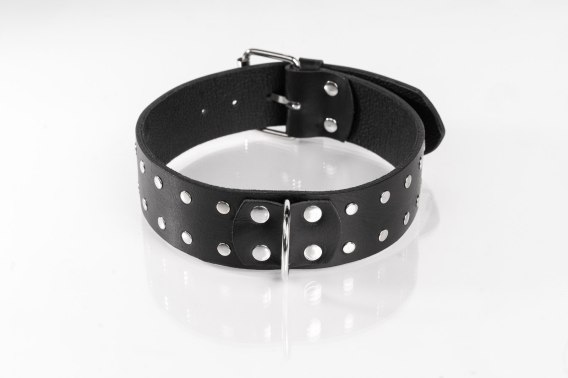 Ciężar skóry, rozmieszczenie ćwieków, obecność uchwytu - każdy element ma funkcję. Wystarczą dwa rzędy. Wystarczy jeden punkt zaczepienia. Wystarczy ta obroża.