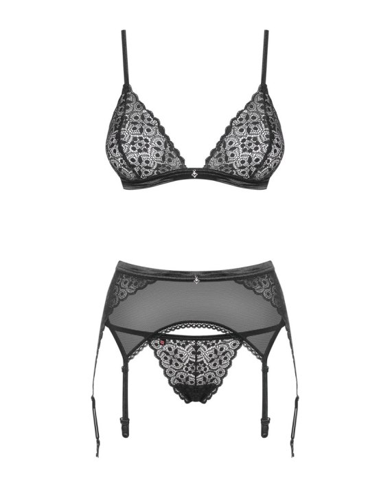 Komplet Shibu to trzyczęściowa propozycja dla kobiet, które chcą połączyć klasę z wyraźnym akcentem erotyzmu. Czerń i geometryczny wzór koronki pięknie rzeźbią sylwetkę, optycznie zaokrąglając kształty i podkreślając to, co najbardziej kobiece. Biustonosz z regulowanymi ramiączkami i zapięciem z kilkoma poziomami pozwala na wygodne dopasowanie, zapewniając jednocześnie stabilne podtrzymanie.