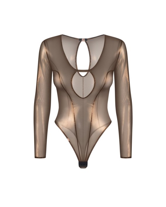 Połyskujące body z długim rękawem Soranna to połączenie elegancji, zmysłowości i wyrafinowanego blasku. Prześwitująca siateczka z delikatnym złotym połyskiem otula ciało niczym druga skóra, podkreślając każdy jego kształt. Długie rękawy nadają całości szyku, a kuszące wycięcia z przodu i na plecach wprowadzają element intrygującego uwodzenia.